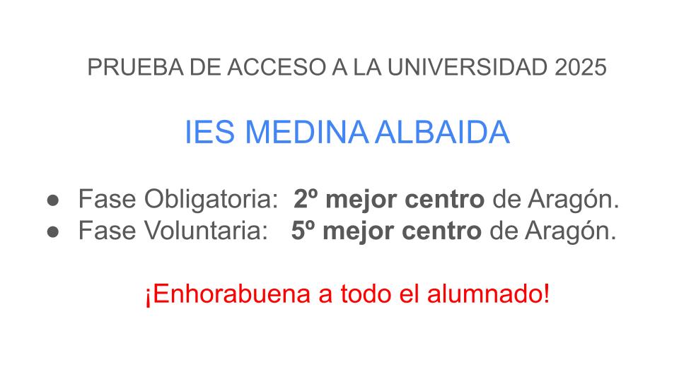 El alumnado del IES Medina Albaida ha conseguido, un año más, muy buenas calificaciones en la PAU 24/25, obteniendo en la convocatoria de junio una calificación media que se sitúa en el segundo lugar en la fase obligatoria y el quinto lugar en la fase voluntaria de un total de 128 centros educativos presentados en Aragón. Estos resultados no son un hecho aislado, resultados similares se han obtenido en los cursos anteriores, y esperemos que nuestros alumnos sigan cosechando buenos resultados en los próximos cursos.